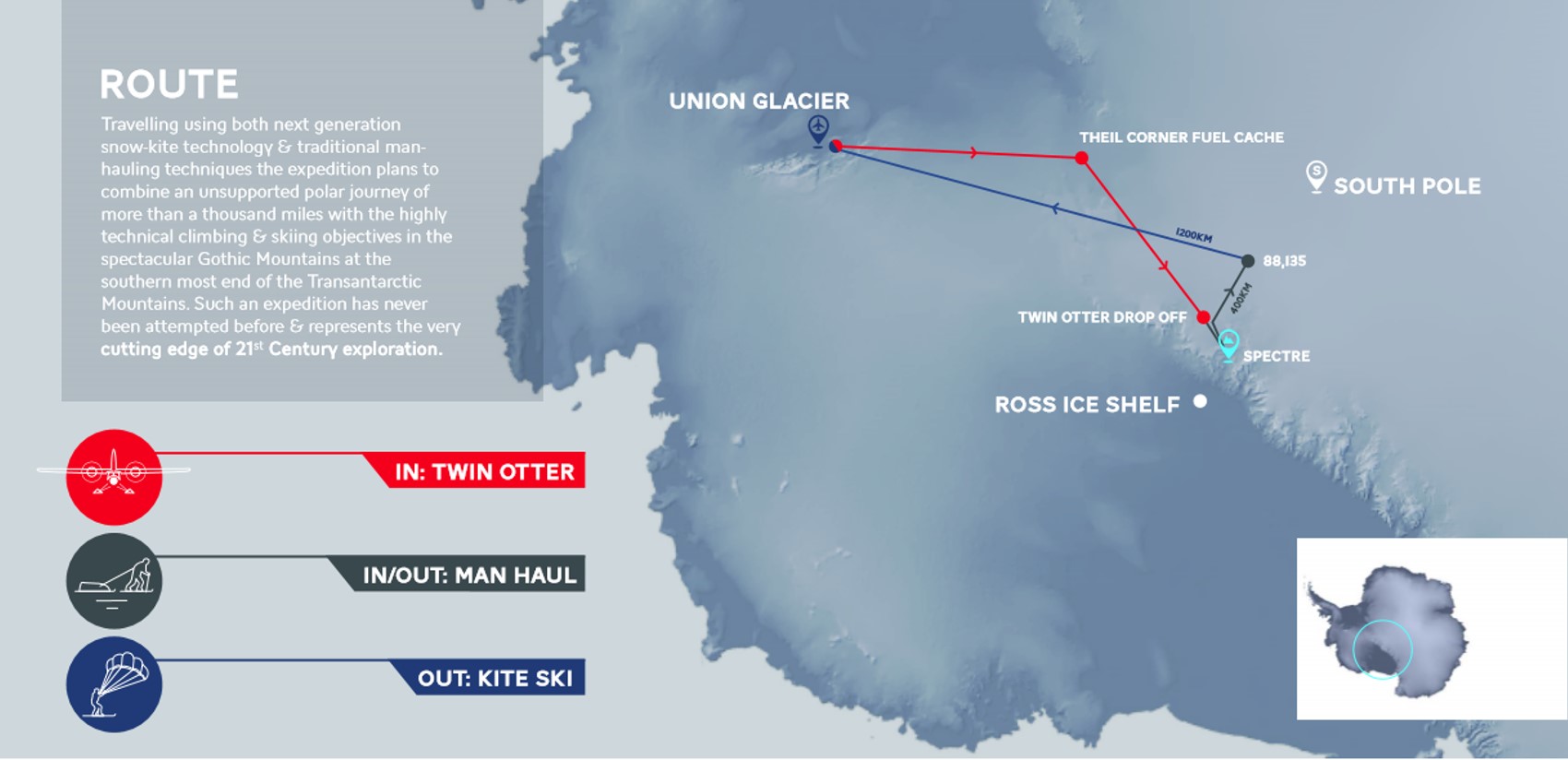 On 7 November, Leo Houlding, Jean Burgun and Mark Sedon will depart from the UK on the first stage of their expedition to climb the 750m tall buttress of the 2,020m Spectre in the Gothic Mountains in Antarctica. Once Houlding, Burgun and Sedon arrive on the Antarctic continent, via South America, their journey there will involve: a flight in a Twin Otter ski equipped aircraft and snow-kiting with 200kg sledges known as pulks for 300km to reach the Spectre; alpine style ascents of highly technical climbs and unclimbed peaks; 400km of traditional man-hauling on cross-country skis, before finally snow-kiting a further 1100km back to the Union Glacier, concluding a complete trans-continental traverse before departing the Antarctic.