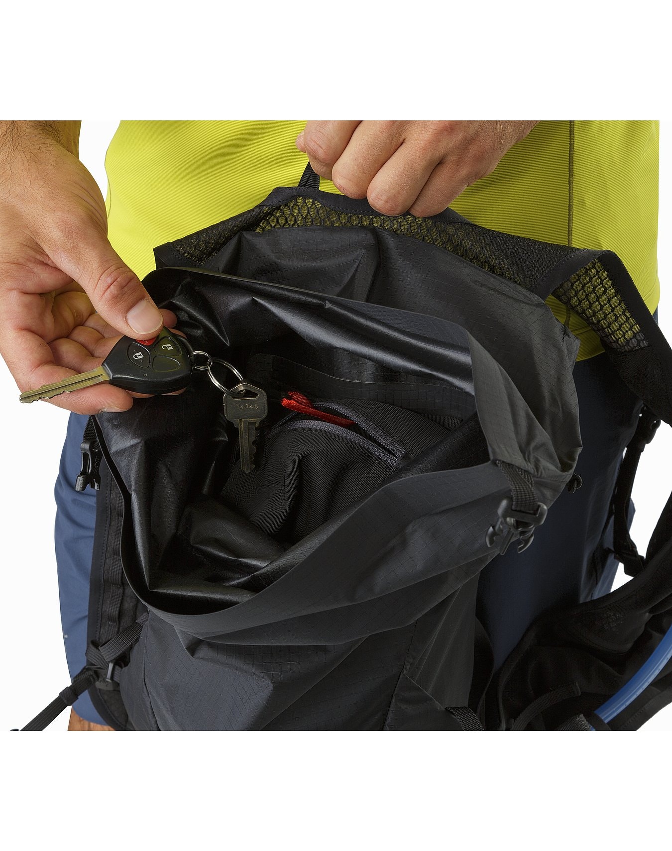 As you would expect from Arc’teryx, the pack looks and feels well-constructed. At 256g without the hydration reservoir, its weight is comparable to other lightweight packs of similar capacity, although the weight creeps up to 417g with the (empty) reservoir. The pack has been designed to feel more like clothing than a pack, with a body hugging “bounce free” construction that has sufficient capacity to carry everything you might need for long distance trail runs or all-day mountain adventures. The 12L main storage compartment is weather-resistant, with a dry-bag style closure. Other than a small mesh zipped compartment for keys or wallet, there is no means of organising things within the main compartment, but this can be easily overcome with good packing. The compartment cannot be accessed without taking the pack off, but is great for securely carrying more bulky items such as spare clothing, first aid kit etc.