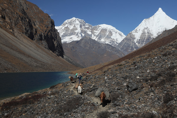 If you are seeking a relatively short but rugged high altitude trek with ample time for unique cultural insights, this ititinerary to trek to Chomolhari Base Camp in Bhutan with World Expeditions is a great choice. Chomolhari (or Jomolhari) touches a mighty 7326m at its summit, yet it has seem very little climbing activity over the years because of its religious significance to the locals – the peak is sacred to Tibetan Buddhists. This trek begins beyond Drugkyel Dzong at Shana, in the picturesque Paro Valley, entering the stunning rhododendron forests and weaving up the valley crossing and recrossing glistening glacial streams. Eventually the landscape opens up to grassy meadows and leads to Jangothang where camp is made below the sacred peak of Chomolhari (7314m). Continuing toward the Nye La (4700m) trekkers are treated to views of the startling Jichu Drake (6794m) and Tshrim Khang, before making the gradual crossing of the pass with views of the Lingshi Dzong perched high on a hill top. The most difficult day of the trek includes crossing the 4950m Yale Pass before descending to the Thimphu River and