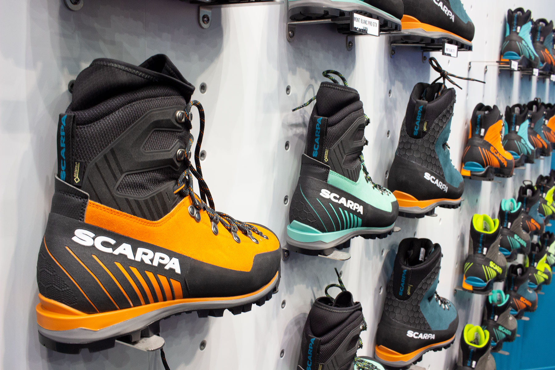 Next stop was the Scarpa stand where it was all about the tweaking of a couple of classic technical mountain boots. First off was the popular Mont Blanc Pro in both men’s and women’s versions. It’s all change here. The boot’s still a classic all-mountain B3, but it gets a complete new sole unit, the ankle cuff area has been redesigned too and looks slicker and more contemporary. The Sock Fit upper remains, but along with the integral bootee cuff gaiter thing, has been lightened up. It’s still visibly a Mont Blanc with the characteristic high ankle cuff, but just more. It’ll retail for £450 when it replaces the current model later this year.
