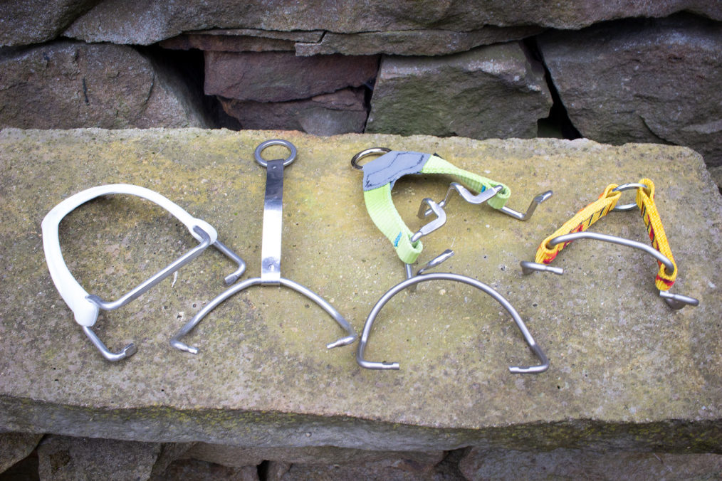 Some bails will spring out relatively easily once you have the ovalised holes lined up with the bail end profile, but it’s not usually that easy. What works for me is to locate one side of the bail in the chosen hole, then larksfoot a climbing sling or length of cord around the other side of the bail. Put the crampon sideways on the floor, then hold it in place – carefully, they are spikey things – with a shoed foot. Then pull up on the cord and carefully line up the bail and the hole before easing it into place. Then remove the sling or cord. Don’t just stick the bail through a sling, once in place, you won’t be able to remove the sling without cutting it. Obviously.
