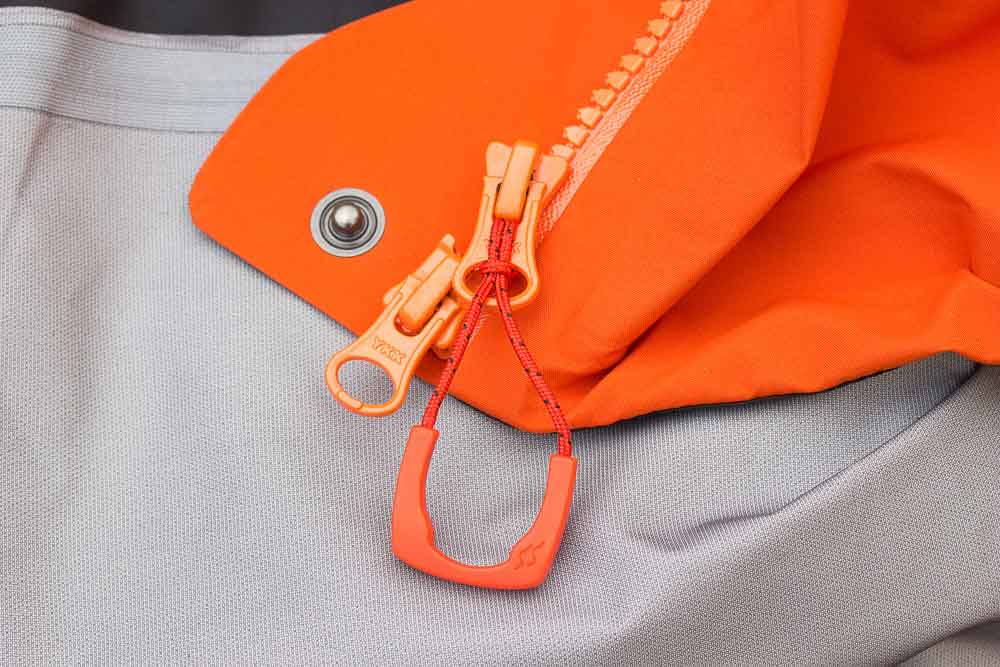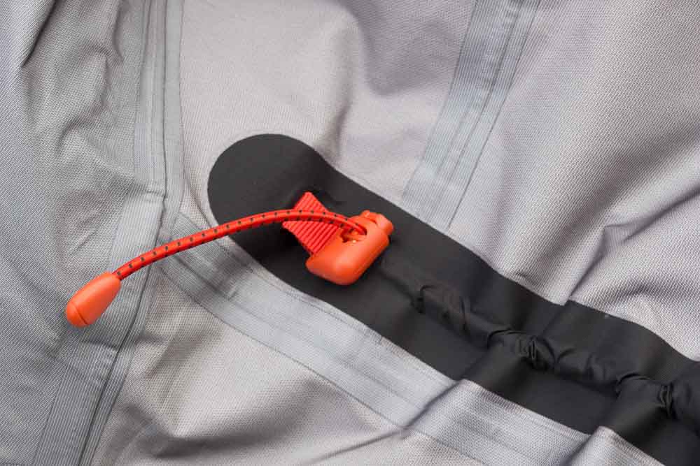 Arguably the Ladakh’s trump card is a superb, helmet-compatible hood. It’s big enough to swallow a climbing lid, while still giving plenty of facial coverage and allowing easy head movement. Normally the pay-off for that is compromised performance with a bare head, but in this case, a new third adjustment at the base of the neck does double duty of reducing effective volume and also pulling in the front cords, so there’s no slack ends to smack you in the face, neat. It’s all topped up with a serious stiffened and wired peak for extra rain protection. Just an excellent, no-nonsense hood design with or without a helmet.