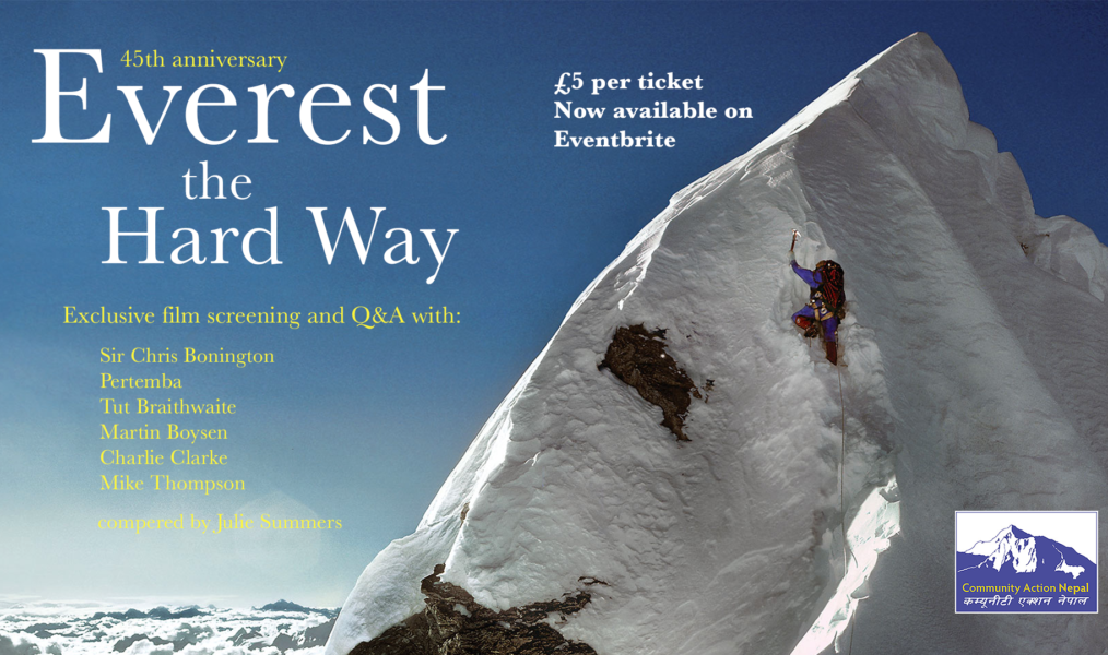 To celebrate this achievement, Community Action Nepal have planned a very special screening of the truly raw documentary, ‘Everest the Hard Way’, followed by an exclusive Q&A with some of the original members of the team – Sir Chris Bonington, Pertemba Sherpa, Paul ‘Tut’ Braithwaite, Martin Boysen, Charlie Clarke and Mike Thompson.