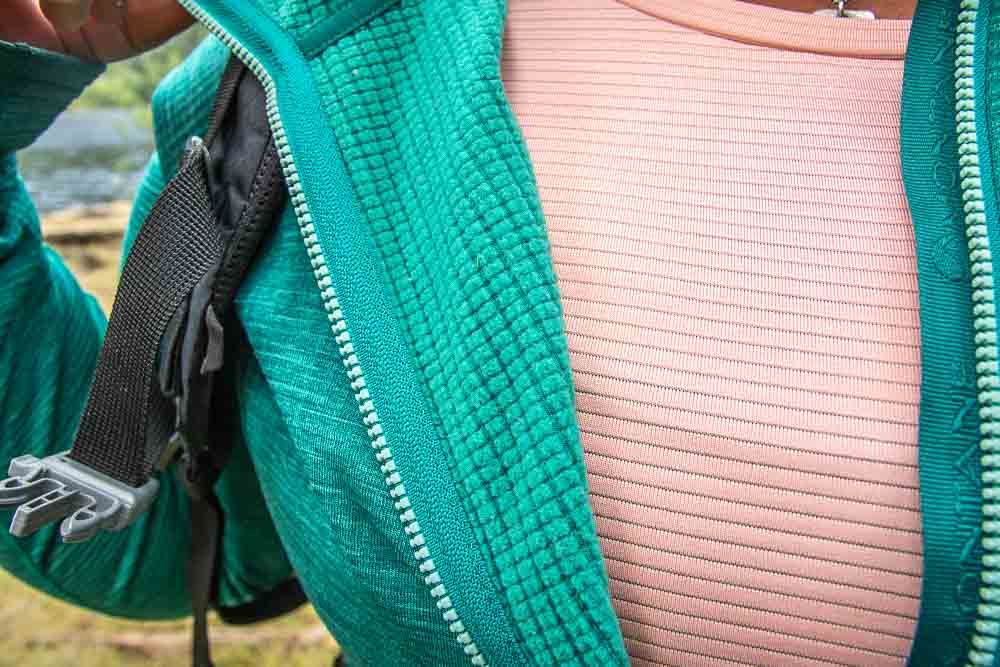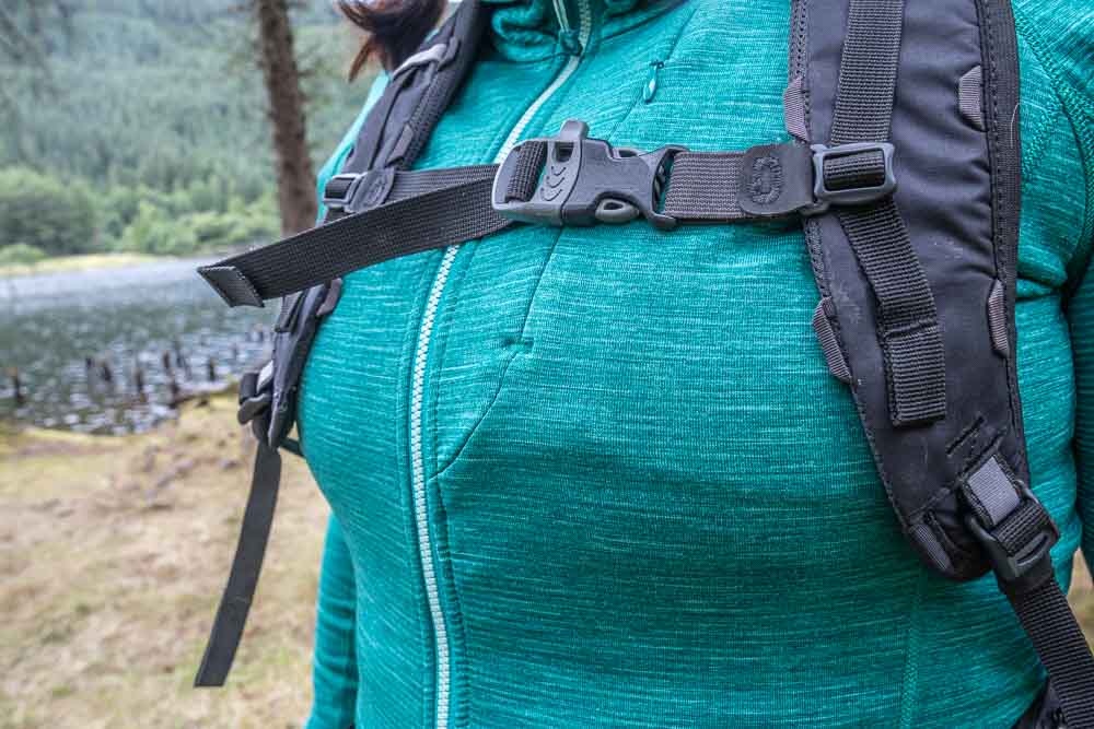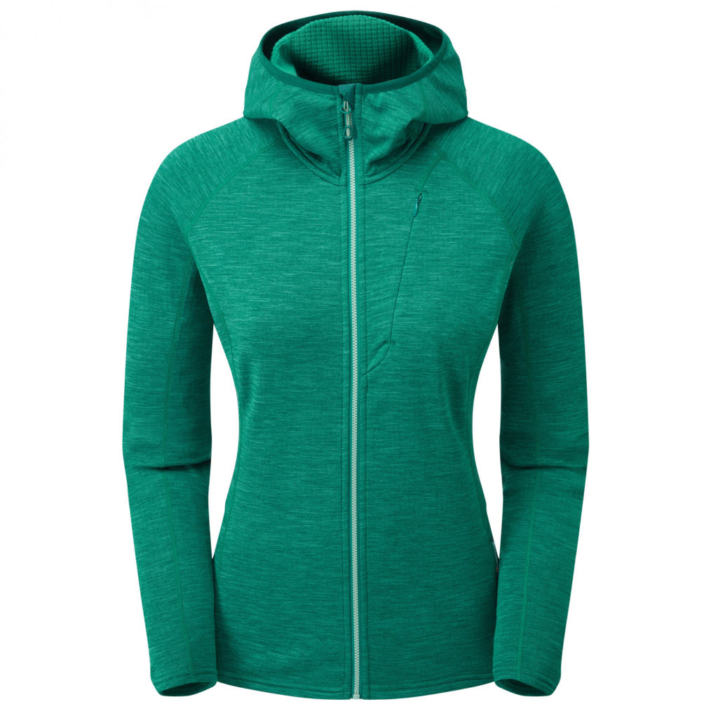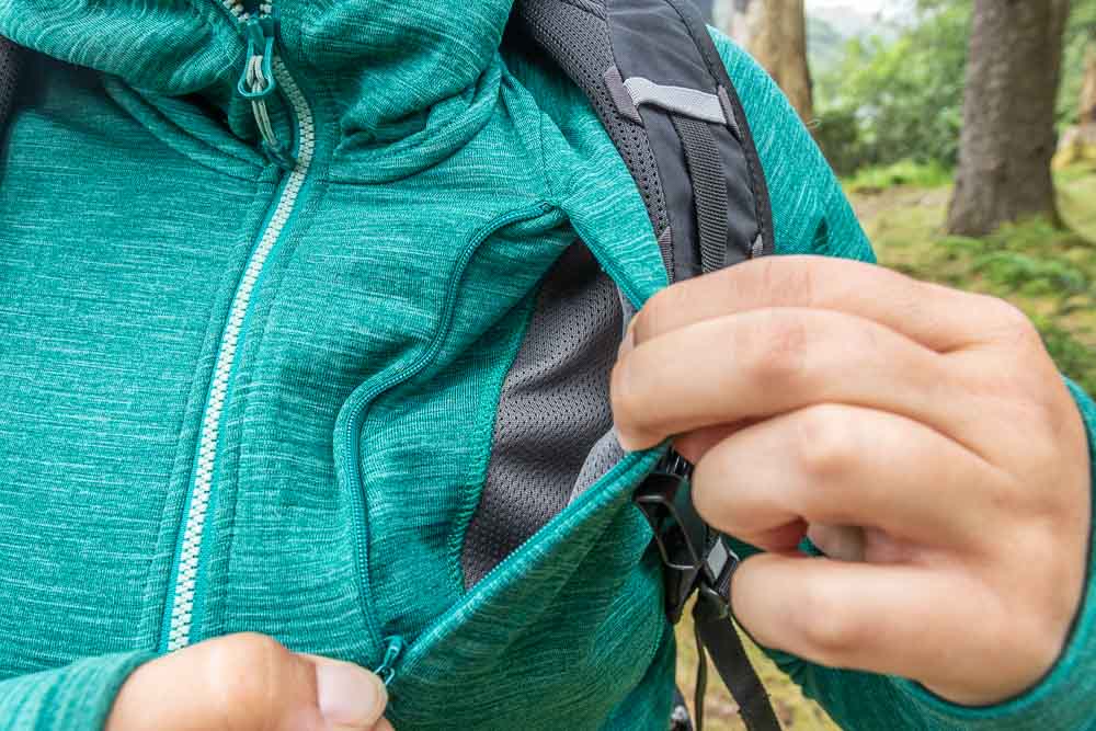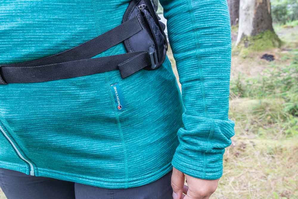 The hoodie weighs about 320g – not bad for a fleece! Montane have included a chest pocket in both the men’s and women’s, but in the women’s version they’ve used a discreet invisible zip. This pocket is big enough to stash snacks or a camera/smartphone. The Protium is suited to both easy jaunts in the hills, and more technical endeavors, easily worn under a harness and the stretch allowing for plenty of movement. So far, ours has held up well against abrasion with regular wear, sometimes walking through undergrowth or rubbing against rock.