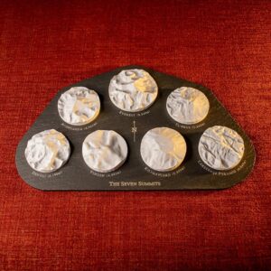 The Seven Summits Signature Slate Plaquette is a striking addition to the living space of any outdoor enthusiast. Displaying an 8km radius around Everest, and a 6.5km radius around each of the world’s other greatest summits, this plaquette really brings the geographical contrast betwen the seven mountain regions to life. From the unmistakable volcanic tabletop of Africa’s Kilimanjaro, to the distinctive twin-peak summits of both Antarctica’s Vinson and Eurasia’s Elbrus. From the world’s crowning summit of Mount Everest, and its base camp to the west, to the jagged arêtes of North America’s Denali, South America’s Aconcagua and Indonesia’s Puncak Jaya. All seven summits are displayed in magnificent scale and meticulous detail. Mountain ornaments are crafted out of sandstone material with a matte varnish finish, presented on an inscribed display base of Welsh slate. Custom inscription available.