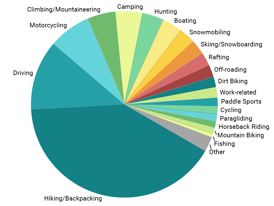 The activity breakdown for SOS incidents in 2024 highlights the many ways inReach users use their device. Though hiking/backpacking and driving/motorcycling were still the biggest categories, there were increases in two very different activities: dirt biking and rafting. Other increases came from camping and mountain biking, while seasonally we see upticks in certain activities such as snowmobiling and backcountry skiing/snowboarding in the winter, boating in the summer and hunting in the autumn.
