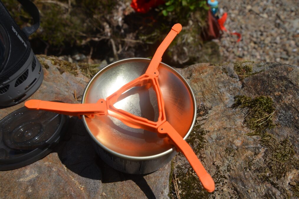 Onto the pot itself, and this will feel very familiar to anyone who has used the Flash before. The insulated jacket incorporates a coloured temperature indicator – silver when cold and red when hot, and the lid incorporates a strainer so that most times you don’t even have to take it off. Boil time for 1L of water is about 2 minutes, which is about as fast as you can get. The stability of the Flash is not as good as traditional stove systems, however this is a downside of tower systems generally, not just the Flash. For campers who want to do more than heat water, the Pan Support 2.0 accessory allows various pots and pans to be used with the Flash, increasing its versatility and making ‘proper’ meals possible.