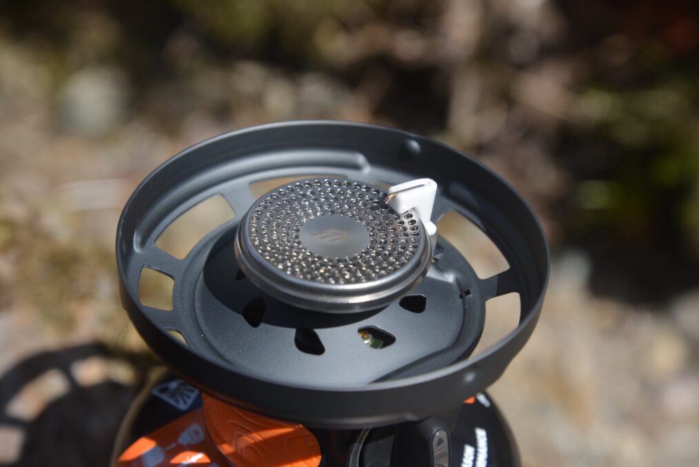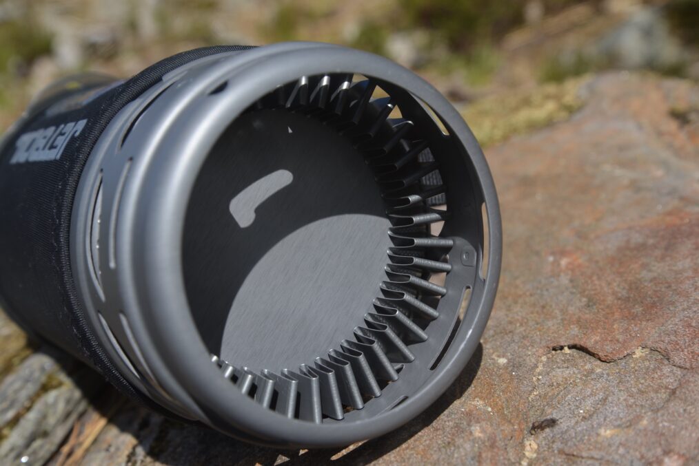 So now we’ve had a bit of Jetboil history and an overview of their stove range, let’s dive into the detail of the Flash 1.0L stove. The stove essentially consists of two parts (plus a gas canister) – the burner itself and the cooking cup/pot which attaches to the burner by a simple twist mechanism. The burner unit sees some updates from previous versions – a grippy rubber covering that makes handling easier and safer when attaching/detaching the pot, and the combined ignition/valve control which is a real improvement, making lighting the stove quicker and easier. The beauty of this design is that you can easily see when the valve is closed, so you can avoid wasting gas in the instance that you connect the canister when the valve is in the open position. One anti-clockwise twist of the dial turns the gas on and ignites it simultaneously. Another improvement is the spark wire on the burner which is now encased in ceramic, making it more durable.