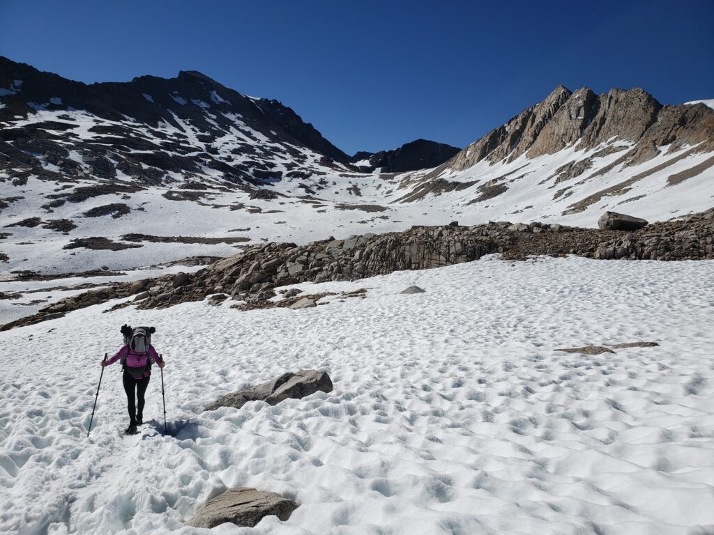 The PCT overlaps with the John Muir Trail (JMT) for approximately 160 miles. Bear canisters and snow gear are required, dramatically increasing pack weight. The trail crosses over a high-mountain pass almost every day, changing your hiking strategy. It became critical to position camp within a mile of the high passes at night to ensure a firm snowpack for safe passage early