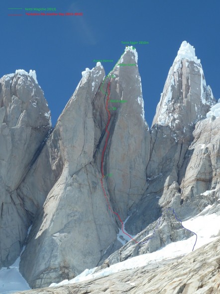 They returned a year with another teammate, Luca Schiera, and at 11.20am on the 2nd of March della Bordella and Shiera reached the summit. The new route has been named “Notti Magiche” (magic nights) in memory of the uncomfortable bivys but also the ‘magical Patagonian nights.’