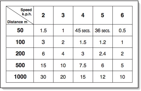 Obviously, all this will change when a variety of other factors are introduced. Terrain, weather, load carried, using crampons, tiredness and the state of the rest of the group will all have relevance. You may find that, on a good day when not carrying much, you can move along at six kilometres per hour. Another time, with a heavy load, going uphill in snow at the end of a long day, you may be down to two kilometres per hour. Knowing what speed you are moving at is the key to getting the final calculation correct. The diagram below sets out speed in kilometres against distance, with the result in minutes. This is a useful thing to copy out, laminate and have with you to avoid needing to do calculations on the move when you also have to concentrate on other things.