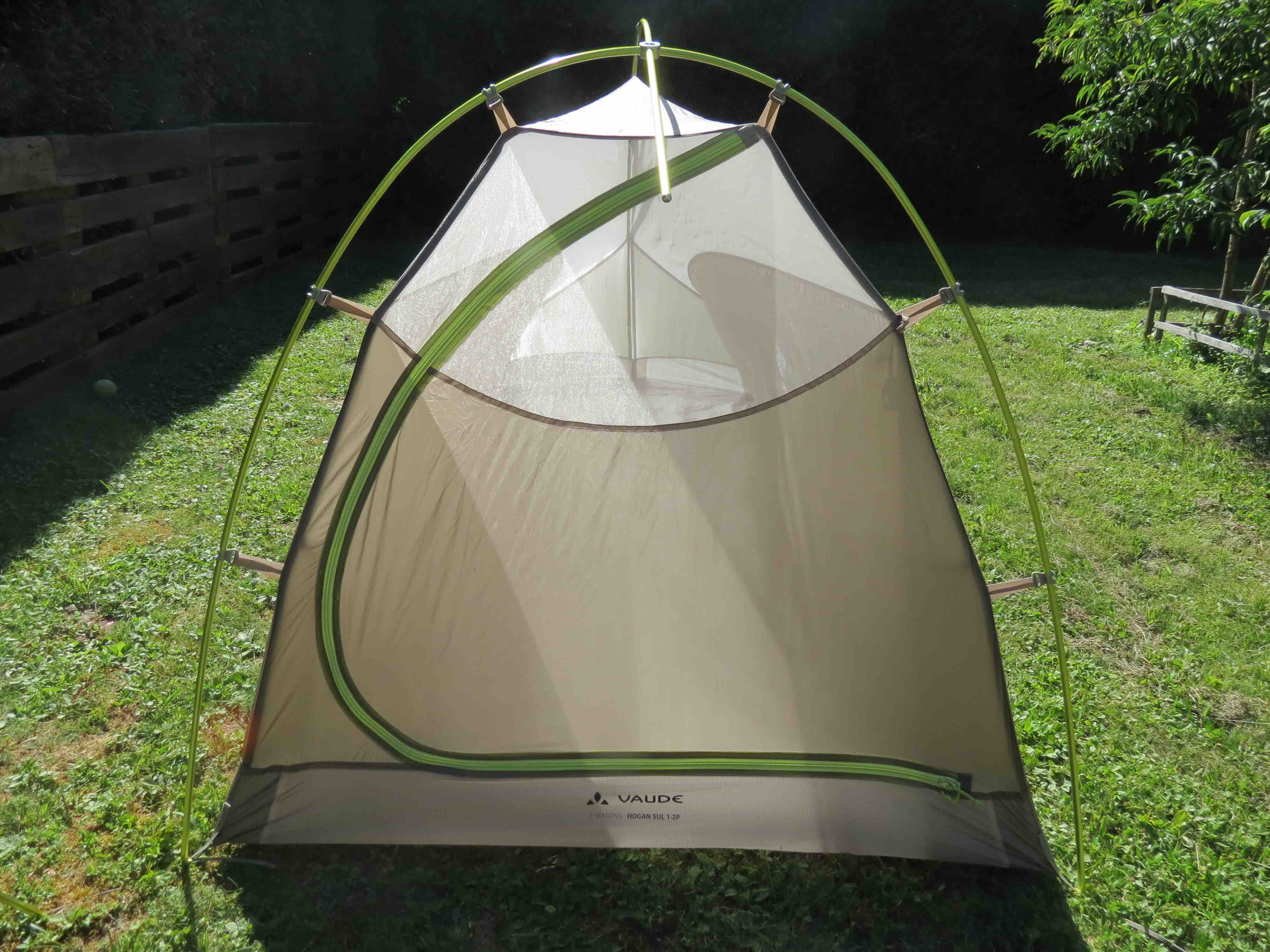The Hogan SUL is not cheap at over £400, but what you get for your money is some of the most advanced materials and construction techniques available on the market. The fly is made of 20-denier ripstop and is silicone-coated on both sides for increased weather protection and durability, while the inner tent is a mixure of mesh and ‘solid’ panels to give a good combination of ventilation and wind protection. The really clever thing about this tent though is the Vaude Silicon Seam Seal which the manufacturer says is the only way it is currently possible to seal silicon-coated fabrics. The two poles, Vaude’s own, are permanently connected via a central hub that gives added stability and also makes pitching the tent that bit quicker and easier.