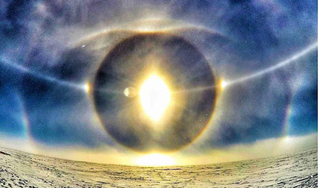Leo commented: “We’ve seen a few halos around the sun, but yesterday either somebody slipped something into our porridge or we were blessed to witness an utterly psychedelic, three dimensional display of polar sun refraction and reflection.  For about half an hour we were overawed by what we were seeing.  Photos don’t do it justice – it was truly amazing.