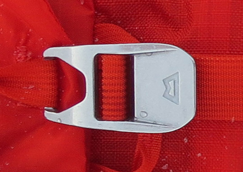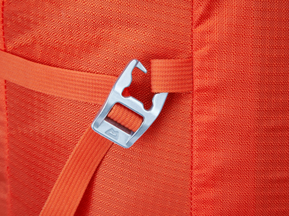 The ice axe attachment system keeps picks tucked away securely, with the metal toggles designed to slot though the head of the tool, fitting axes from all major hardware manufacturers. The removable side compression straps use a unique clipping system, like that found on the main compartment strap, where a metal fastener with a thin slot is hooked and twisted onto a fabric loop. On first impressions this seems fiddly, but in practice it worked well, even with thick gloves on. Like most things on the pack, the system for removing and attaching the compression straps is simple, light and effective.