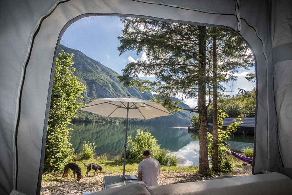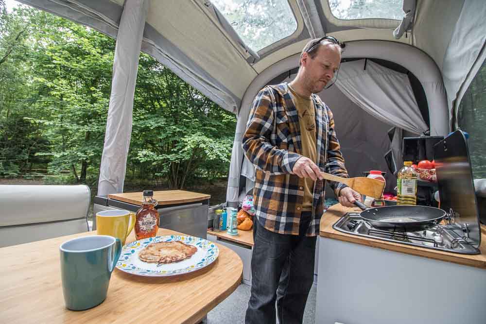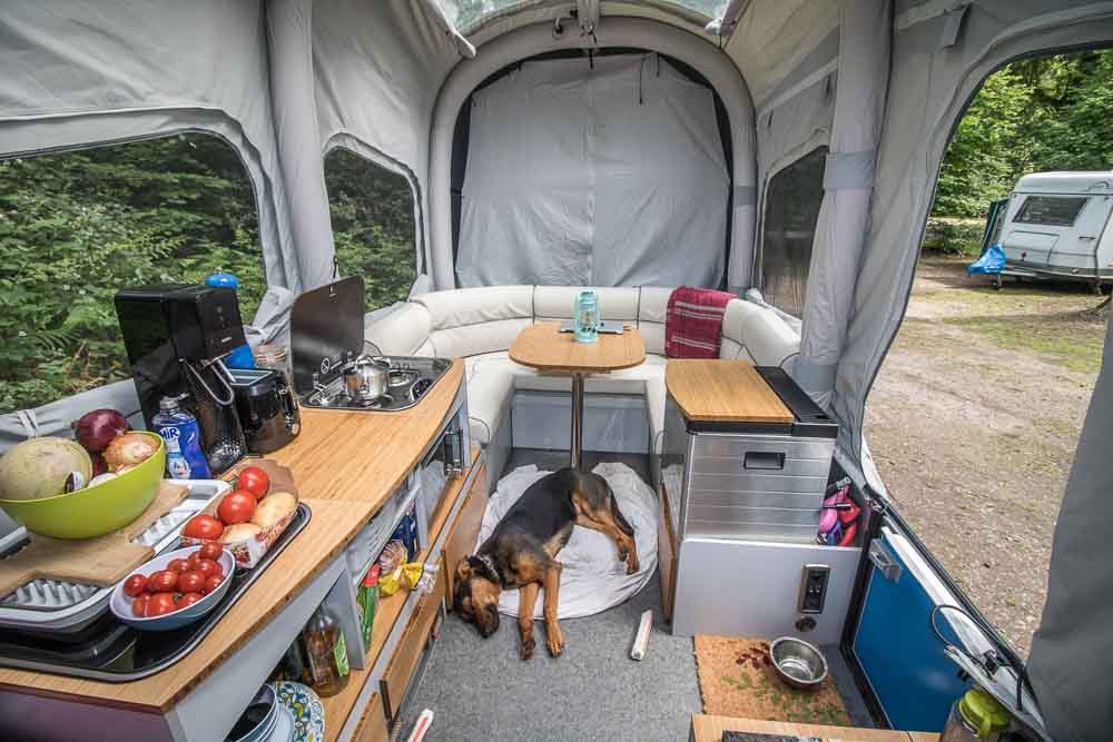The inside space was well laid out. In fact, we never felt cramped during the entire six weeks. The tall ceilings and many windows, as well as light colour palette, gave it a very spacious feel. The kitchen was well-equipped with a small fridge, a sink with running water, a two-hob gas stove, a microwave, and some storage areas for keeping food, dishes etc. The built-in storage under the sofa meant that we could bring a couple of extra appliances too, such as a toaster. The sofa was comfortable and was a great place to sit and work, or eat dinner. The table can be taken down (which we sometimes did when we weren’t using it, just to create some more space inside) and the cushions rearranged to make a third bed, though having six people sleeping inside for anything more than a couple of nights might be pushing it. The beds were comfortable and the inner tents around the beds meant that we could zip off the area for privacy. The small portable toilet stashed in a storage compartment is a great addition when travelling with children, but we found ourselves using the campsite facilities more often than not. LED lighting strips lit the entire camper and no extra light was necessary. These lights could also be dimmed which was a nice touch. There are optional extras such as a ‘home’ theatre (seriously!), or an awning that provides additional living space.