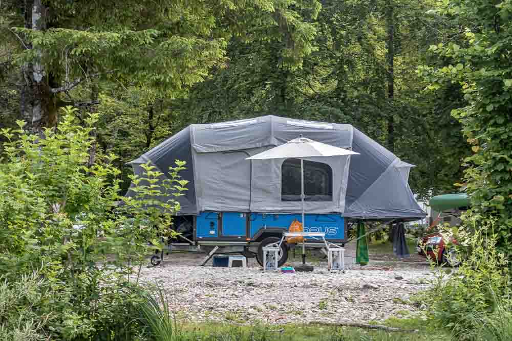 We had our fair share of rain on the trip, and while the tent never leaked (nor did the trailer when packed up), there was still a bit of dampness that made its way inside during the wettest periods as would be expected – just enough to make sugar clump or slightly crinkle pages of a book. This only made us consider how we stored a couple of things – a canister for the sugar and a dry bag for our books! A small consideration really. We were lucky not to have to pack it up when wet, and it always dried out quickly once the sun came out. While the bottom metal part of the door locks, somebody could make their way inside by unzipping the top part of the door if they really wanted to. We felt pretty secure in most places we stayed, but there were a couple of times that we locked our valuables in the car while away. If I had to add something to my wish list when it comes to the Air Opus, I suppose it would be a built in step into the trailer (although you can buy a metal step from Opus), and if I’m really going to nitpick, perhaps some additional access to the storage under the sofa – being able to access it from the sides rather than having to rearrange the cushions each time.