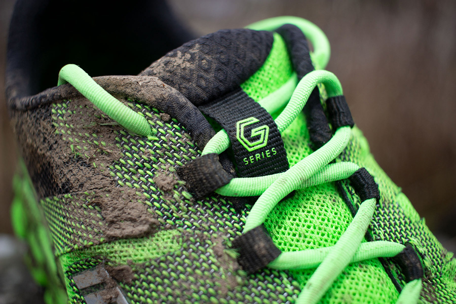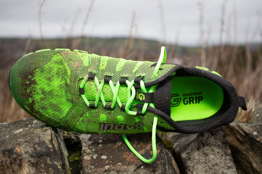 The buzz around the shoe and inov-8’s new G-series generally, is all about Graphene. It’s a substance that’s harder than diamonds, 200 times stronger than steel and stretches 25% without breaking. It was discovered in Manchester and won a Nobel Prize for the scientists who produced it from Graphite mined in the Lake District.