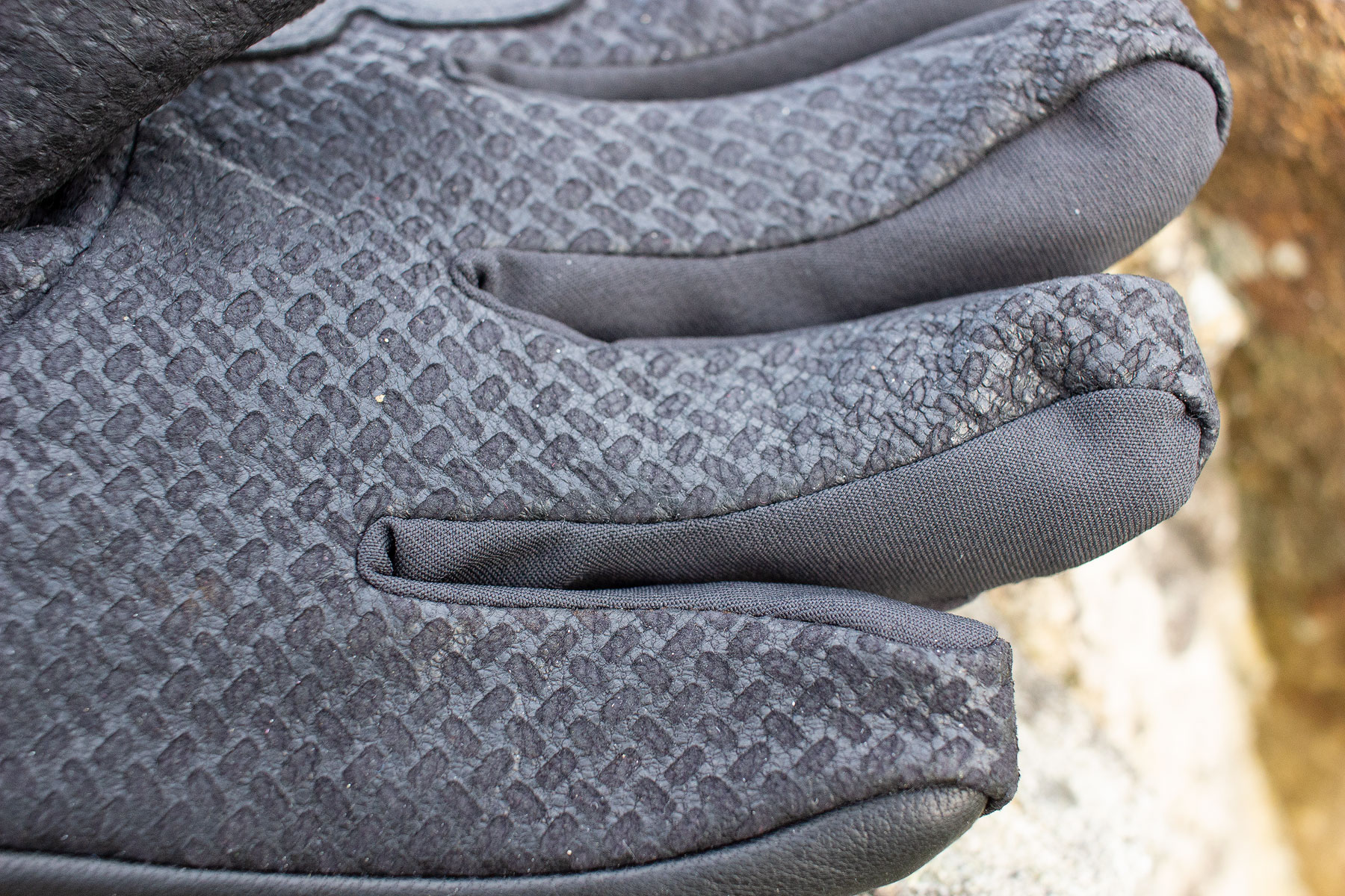 So how does it work? First impressions messing about with a pair of BD Vipers are excellent. The Pittards Oiltac leather – it’s a polymer gives excellent mechanical grip, both on the rubber gips of the axe and on the anodised metal shaft. Just as importantly, there’s minimal movement within the glove when you’re gripping the glove, I’d say nothing that’s really detectable or significant, which adds up to what feels like a really direct, confident grip. In comparison, a well-regarded, general mountaineering guide-type leather glove gives significantly more movement between glove and grip. Hold the hand of an axe tightly and significant sideways rotational play at the pick end. You can also feel the insulation of the palm compressing under grip, something the BitterBlaze doesn’t do.