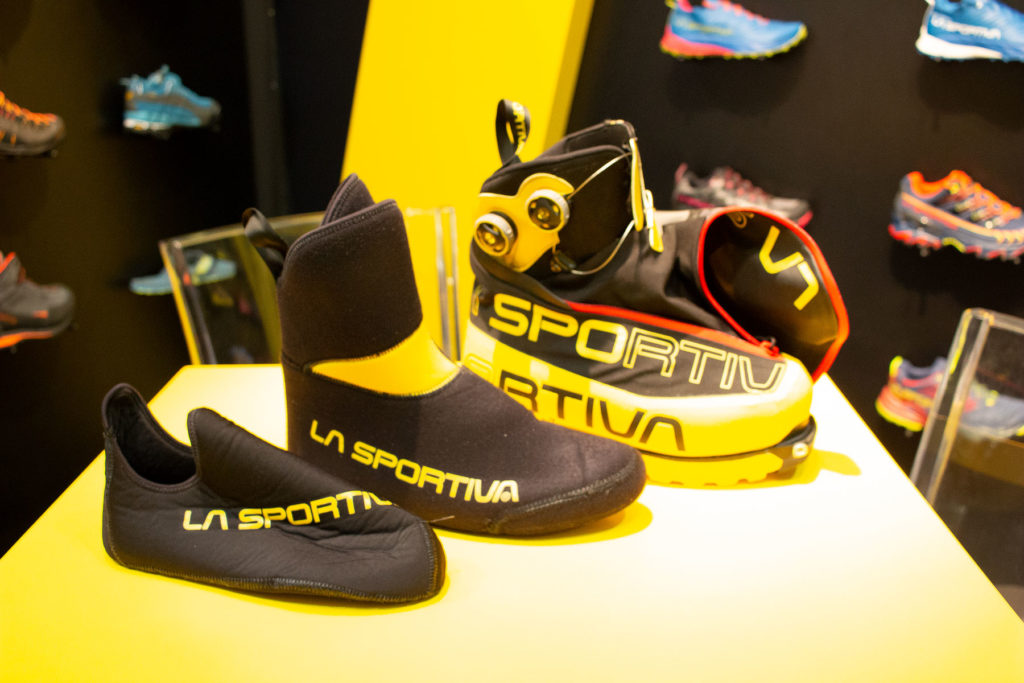 We kind of liked the look of La Sportiva’s TX Top, an approach shoe with a built in waterproof stretch gaiter intended for winter approach work, but if you’re going much higher up the mountain, the brand has updated the high altitude Olympus Mons to create the Olympus Mons Cube, designed for ultra-cold, high altitude conditions. Retailing for a cool £835 – what are you toes worth? – it’s been designed with input from Simone Moro and tested in Siberia of all places. It has a removable double-bootie system with a 4mm EVA shoe nested inside a talled high-cut, 6mm one, which in turn sits inside the outer bot with integrated Cordura gaiter with reflective aluminium stuff .