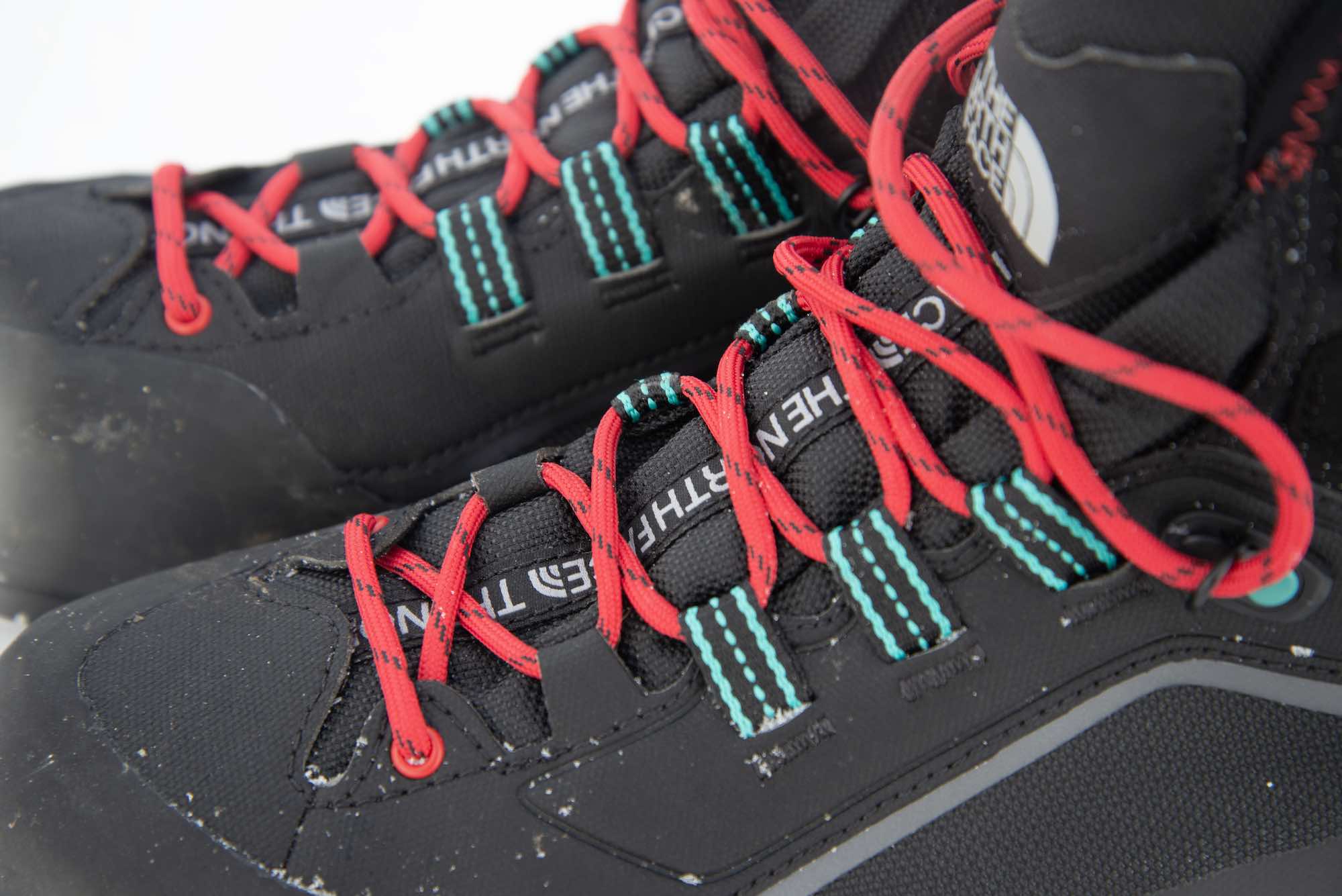 The upper of the Breithorns is all synthetic, with a ripstop fabric and various overlays making what feels like to be a very durable boot. Rubber toe and heel rands circle almost the whole circumference of the boot, while a padded ankle area is topped off with a stretch Lycra collar that’s intended to help keep debris out. The lacing system uses a mixture of fabric and metal eyelets, and it works well enough, however we didn’t manage to get any ‘lock off’ (in a speed-lacing sense) that TNF suggests should be possible. A large fabric loop at the rear of the boot aids getting the boots on and off, and could also be used to clip them to the back of your harness if you wanted to swap to climbing shoes or approach shoes during your day out.
