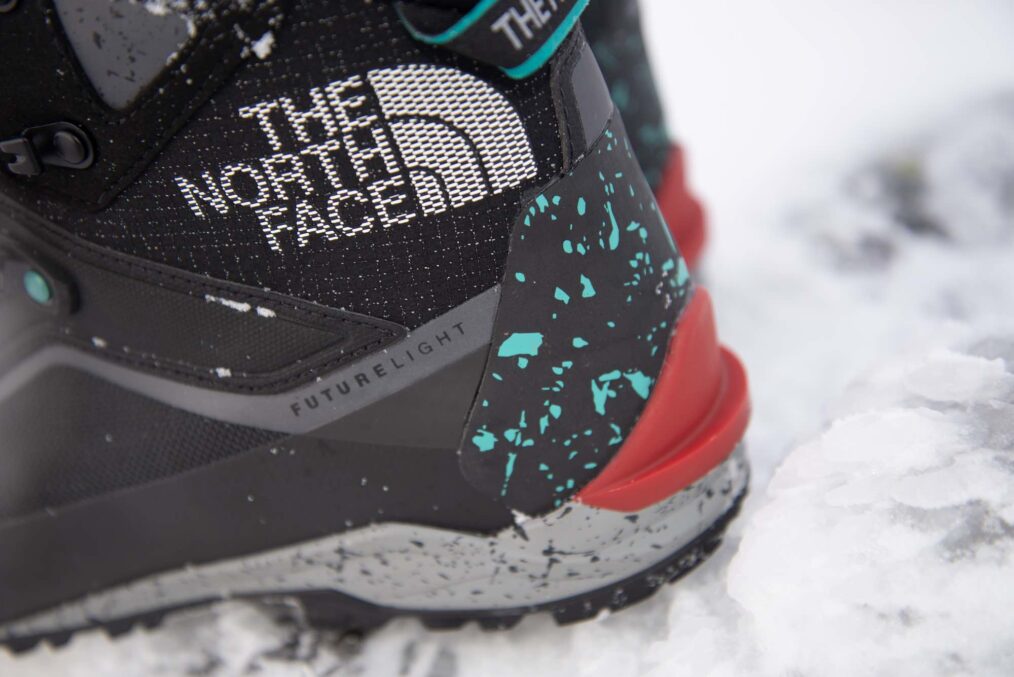 The North Face had a big launch for their Summit series apparel and footwear ranges this winter, and the footwear range includes no less than four models, from the Cragstone Pro approach shoe, right up to the Torre Egger boots at £630, a super-stiff and technical boot for ice climbing. In between these are the Cayesh double boot, which would appear to be well suited to winter mountaineering, and the model we tested, the Summit Breithorn Futurelight Hiking Boots (to give them their full name), which is a light mountaineering boot with semi-automatic crampon compatibility. The whole range is distinctive-looking, with bright red and green colour accents on otherwise black boots, and the funky design even stretches to an animal print-like pattern on the Torre Eggers that is sure to elicit mixed reactions from buyers – some will love it, and some will hate it. The Breithorns, however, are fairly restrained in comparison, with a green paint-fleck type design on the heel bumpers and red and green coloured laces and eyelets to provide some colour.