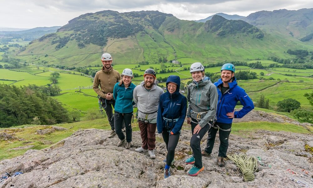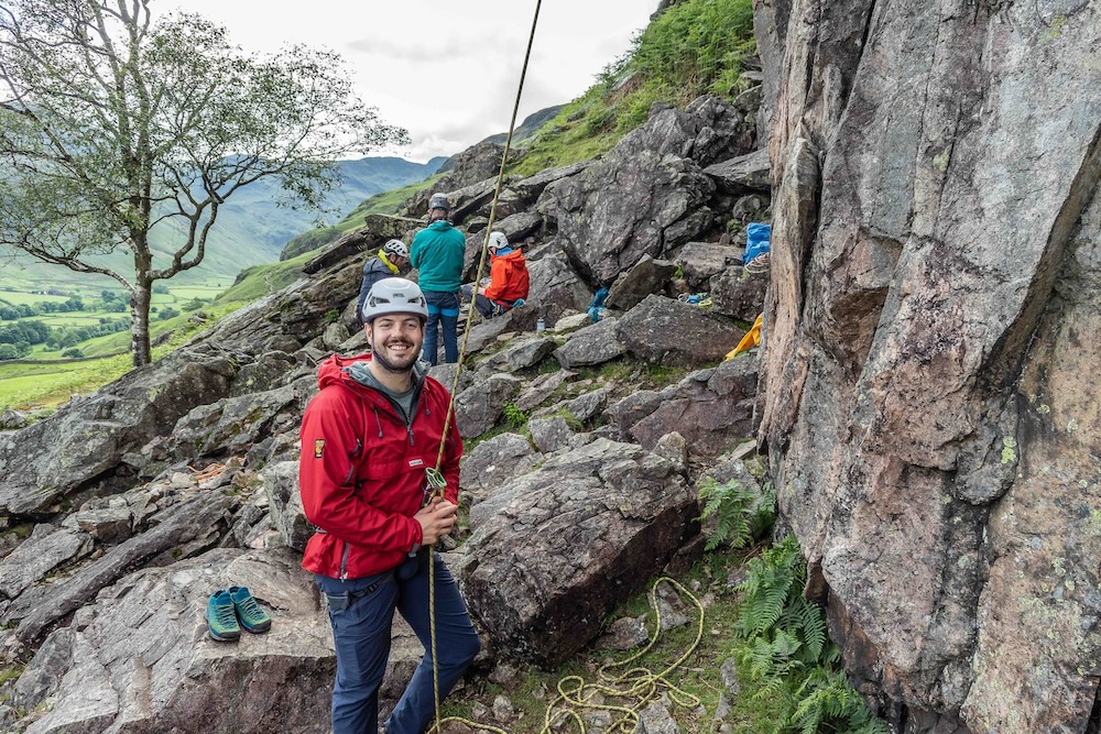 Day 2 saw Chris join instructor Greg and a keen group of climbers to head to Stickle Barn Crag, a short but steep walk up from the Old Dungeon Ghyll Hotel, to practise making top rope anchors at the top of the crag. This is a super-useful skill for all levels of climbers; although more associated with novice or inexperienced climbers, it is also used by experienced climbers to practise hard moves on a route before leading it. Stickle Barn Crag is often used by instructors because of its easy access and quick-drying rock, and we passed another group getting ready to climb from the bottom as we headed around and up to the top. Before we got stuck into building anchors, we spent a good chunk of time practising gear placements with nuts, cams, slings and hexes – with Greg challenging us to find as many as possible in 20 minutes. He explained his rating system of the quality of placements from 0 to 5, with 6 being absolutely beyond reproach (e.g. a sling around a one-ton boulder!). Inevitably some of our placements were better than others, and Greg pointed out how they could be better, or if they shouldn’t be used at all. The meat of the clinic, though, was Greg showing us how to build the top rope anchor, by putting in multiple pieces of gear to create anchors, equalising the anchors and then bringing the rope down to a clip-in point that would dangle over the edge of the cliff face, protected by a canvas rope protector to stop the rope getting damaged. The clinic was excellent in terms of understanding the principles of building this kind of anchor, however it was clear that most of us would have to go away and work on it to become proficient in its use!