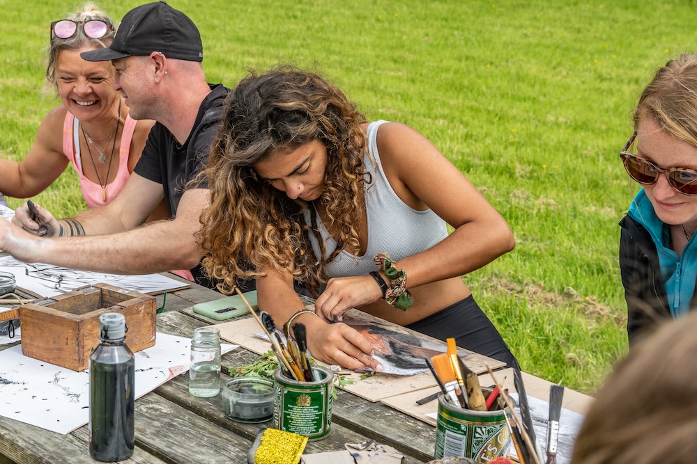 Back at the basecamp, Amanda joined the Creative Drawing Class with Tessa Lyons, a perfect way to spend a free afternoon while others were out exploring the crags, boulders, and hills. With no clouds in the sky, Tessa decided to set up some picnic tables in the field so that we could use the surroundings of the valley for inspiration in our drawings. Even if you don’t know who Tessa Lyons is, chances are you’ve seen some of her lovely artwork, having a huge portfolio and having worked with numerous brands and organisations (her work can be found at: www.tessalyons.co.uk). The tables were set up with paper, charcoal, ink and some fun tools such as feathers and bubble wrap. She had us listen to a couple different types of music and we let the music inspire our markings on the page – we weren’t aiming to draw anything in particular, just allowing the music to translate into art. After, we moved onto the landscape portion of the class. Tessa did a demonstration and explained how she works out proportions as well as giving us insight into her creative process. We had plenty of inspiration all around us – trees, hills, waterfalls, and lots of light and shadow hitting the rocky outcrops. Although we were all looking at the same landscape (aside from Arc’teryx athlete Holly who was facing the opposite direction!), every drawing was very different and uniquely beautiful. I hope she’ll return again next year, and highly recommend giving it a go, even if you’ve not yet discovered your inner artist – you may just surprise yourself!