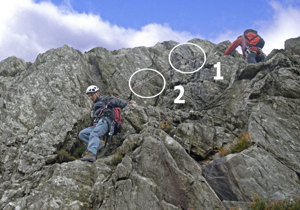 By ‘non serious’ I mean that should the second fall, the ground is easy enough that they can get back onto the rock quickly and start moving again. If there is a chance the scrambler may have to be lowered back down or swing into space, the methods below are not suitable.