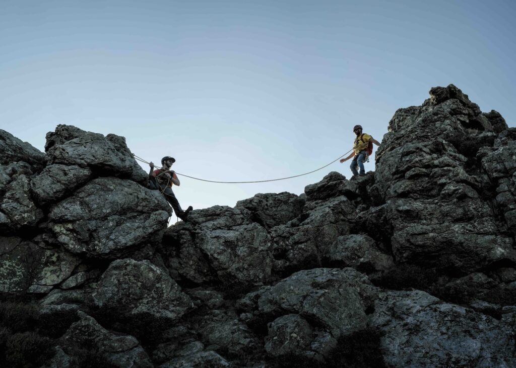 You will know when you have progressed to mid grade scrambles because the difficulties become more concentrated, the routes become steeper and moving together is too risky. This is a personal decision; one person’s mid grade scramble is another person’s rock climb. More difficult scrambles are often broken up into several sections called ‘pitches’, with a stance – or ‘belay’ in rock climbing parlance – after each section. To tackle more difficult scrambles you will need to carry more equipment and start to use tactics and ropework more akin to rock climbing, but with some differences.